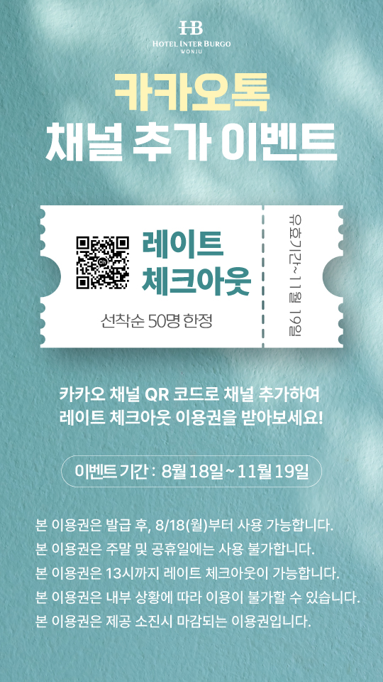 이벤트 카카오톡 채널 오픈 이벤트(마감) 관리자 기간2025.08.18 ~ 2025.09.11 조회수445 목록으로 이전글 인터불고 송년의 밤 다음글 2025 대한민국 숙박세일 페스타