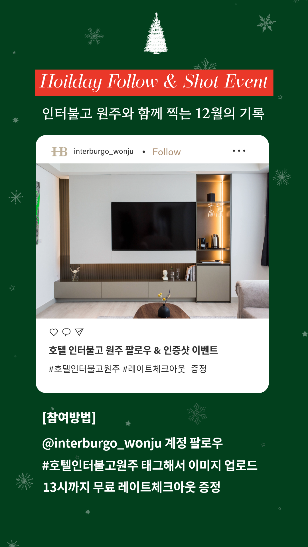 이벤트 12월 SNS 인스타그램 팔로우&인증샷 이벤트 관리자 기간2025.11.27 ~ 2025.12.31 조회수583 목록으로 이전글 2025 대한민국 숙박세일 페스타 다음글 인터불고 원주 플친 추가 이벤트