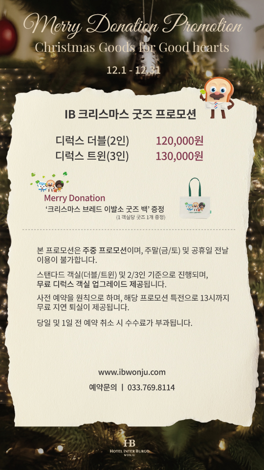 패키지 <12월 크리스마스 굿즈 프로모션> Marry Donation Promotion 관리자 기간2025.11.27 ~ 2025.12.31 조회수351 목록으로 이전글 <8-9월 생일 프로모션> Happy Birthday Stay 다음글 <12월 윈터 시즌 프로모션> Winter Vacation