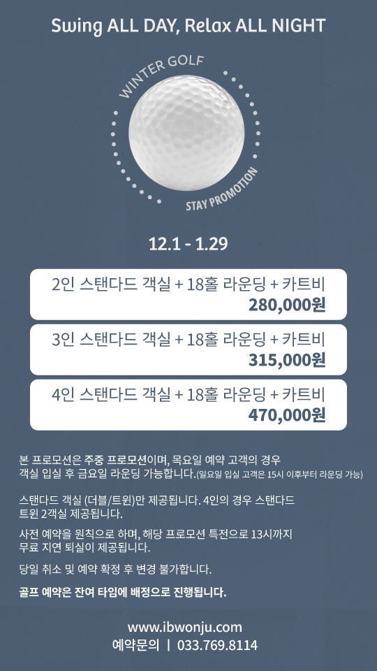 패키지 <12월 골프 객실 프로모션> Swing ALL DAY, Relax ALL NIGHT 관리자 기간2025.11.27 ~ 2026.01.29 조회수518 목록으로 이전글 <12월 윈터 시즌 프로모션> Winter Vacation 다음글 <졸업입학 프로모션> Happy New Start