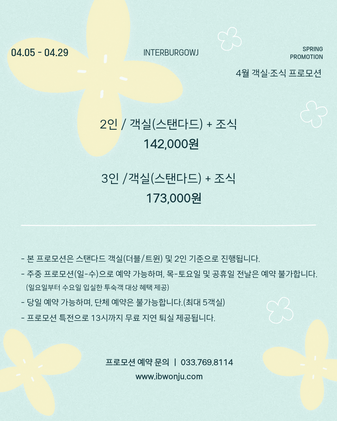 패키지 <4월 객실·조식 프로모션> STAY, SIP, SPRING 관리자 기간2026.04.03 ~ 2026.04.30 조회수144 목록으로 이전글 <객실 프로모션> 발렌타인 러브 인 스테이 다음글 다음글이 없습니다.
